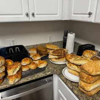After doing a bit of inventory and completely invading the kitchen counterspace, I counted 6 Dutch crunch loaves, 10 small rolls, 5.5 cheesy loaves, 1.5 whole wheat loaves, 3 herb loaves, 3 jalapeno cheese loaves, and 5.5 bleu cheese loaves.