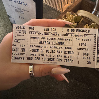 In other news, while my dad is in the running to be NBC Sports Bay Area's All-Star Teacher (reminder to vote daily for Greg Martin here), I saw another notable all star this week. If you know me, you know I love drag, so when my friend Mel facetimed me and said she won an Instagram giveaway for a show, I was immediately down. The famous and iconic Alyssa Edwards was coming to San Diego on her Crowned tour, and Mel had just secured us two free GA tickets! For those of you who may not be familiar, Alyssa Edwards is known for her appearance on Ru Paul's Drag Race season 5, Ru Paul's Drag Race All Stars season 2, and her current reigning title as the winner of Ru Paul's Drag Race Global All Stars season 1. She is incredibly talented, funny, and meme-able with lines like "BEAST!", ".....Backrolls!?", and her famous tongue pop.